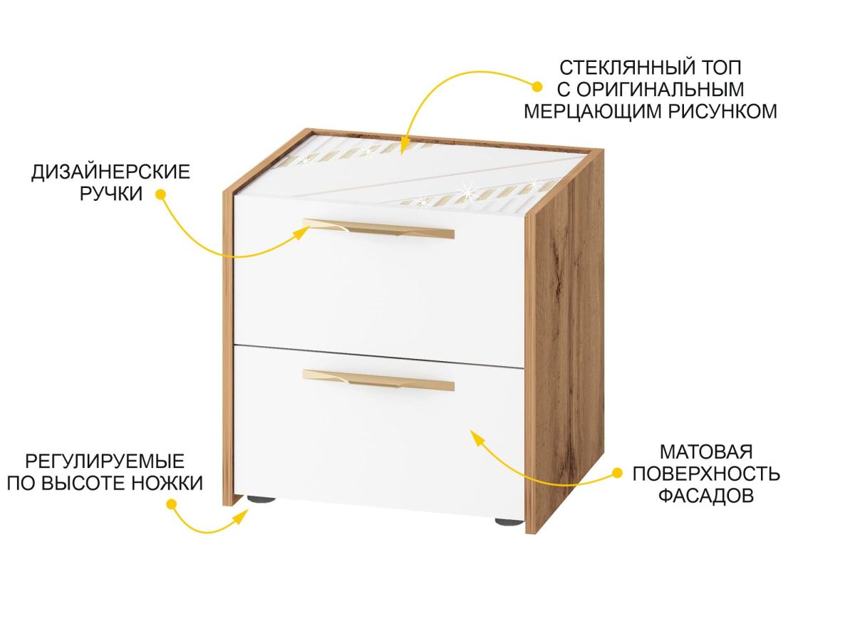- Топ тумбы декорирован дизайнерским рисунком на стекле. Сочетание матовой и глянцевой поверхности формирует оригинальный узор. Благодаря наличию стекла на крышке комода глиттерный рисунок не стирается и не выцветает со временем.