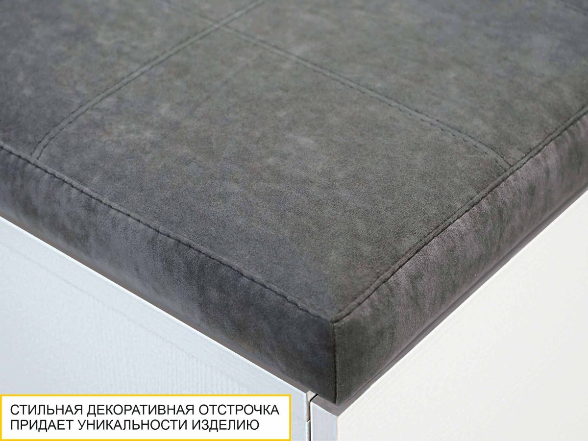 - Встроенное мягкое сиденье выполнено из качественного и упругого наполнителя. Для обивки используется приятный на ощупь софт-велюр, который не требует специального ухода и легко чистится от бытовых загрязнений.