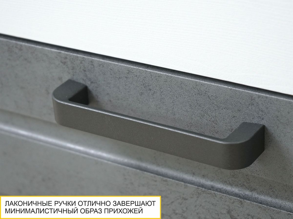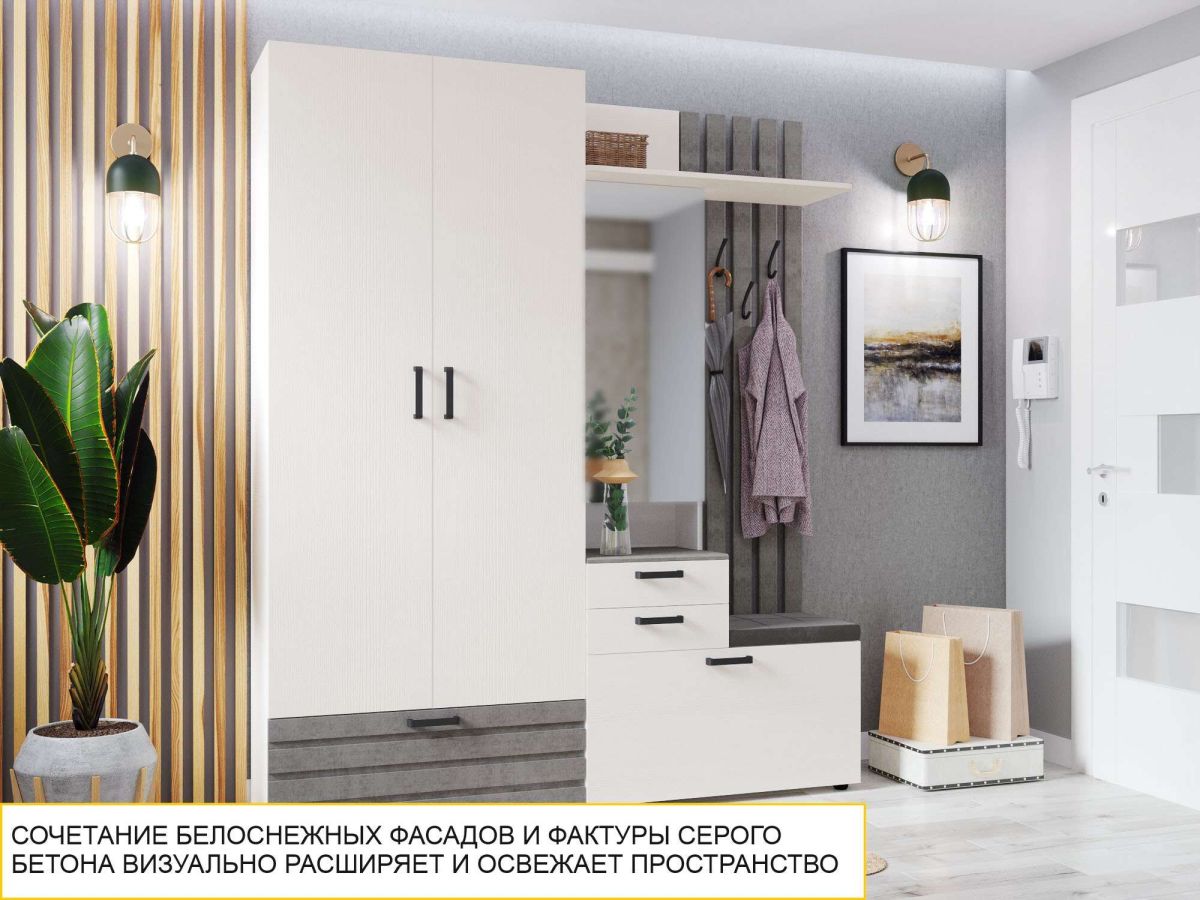 - Трендовое сочетание белоснежных фасадов с имитацией древесной текстуры и фактуры серого бетона позволяет визуально расширить пространство и сделать интерьер Вашей прихожей стильным.