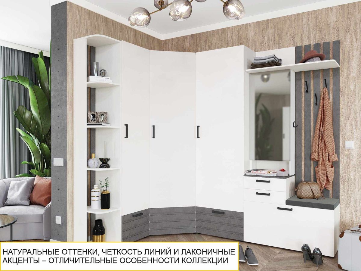 «Денвер 400» – современное решение для обустройства стильной и функциональной прихожей. Натуральные тона, правильные акценты и четкость линий – отличительные особенности коллекции. Фактура бетона на фасаде вносит элементы стиля лофт и добавляет уникальности прихожей. Модули коллекции комплектуются высококачественной фурнитурой, которая прослужит долгие годы.