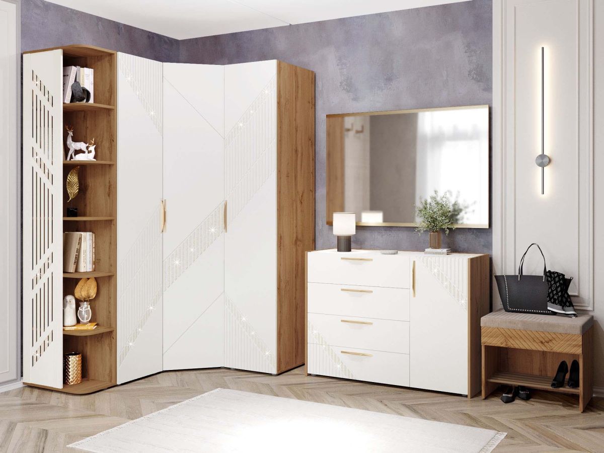 Угловой набор мебели для прихожей «Монако 403 170» является частью модульной серии «Монако». «Монако 403» – образец элегантного стиля и утонченного вкуса. Сочетание матовой белоснежной поверхности фасадов с благородной древесной текстурой «Дуб Вотан» подчеркивает утонченный дизайн коллекции.