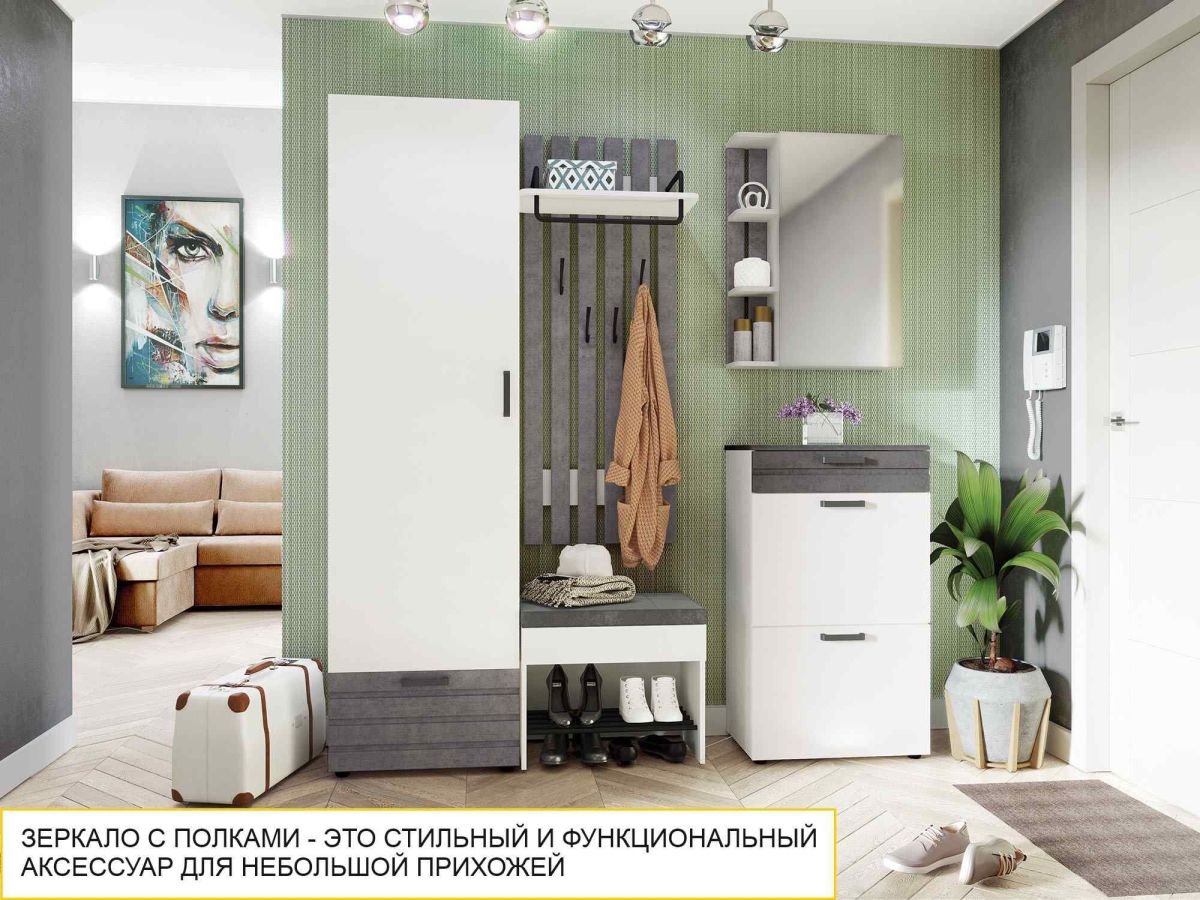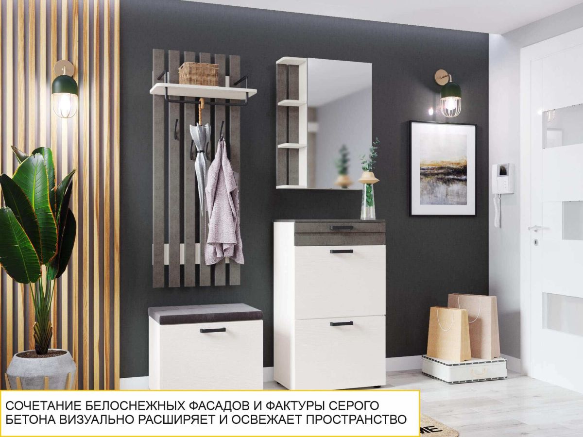 - Трендовое сочетание белоснежного цвета и фактуры серого бетона позволит визуально расширить пространство и сделать интерьер Вашей прихожей стильным.